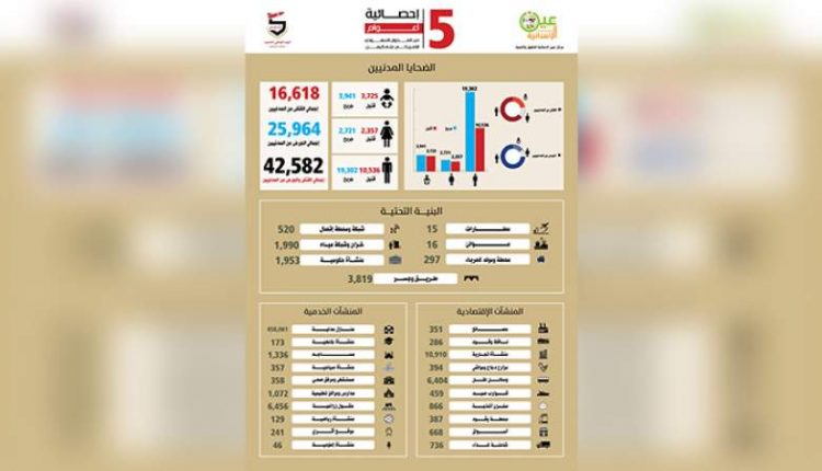 مع اكمال العدوان السعودي الأمريكي عامة الخامسة أصدر مركز عين الإنسانية للحقوق والتنمية تقريره الدوري كاشفا عن أرقام صادمة للضحايا المدنيين والمنشئات المدنية في اليمن جراء القصف المباشر للتحالف.