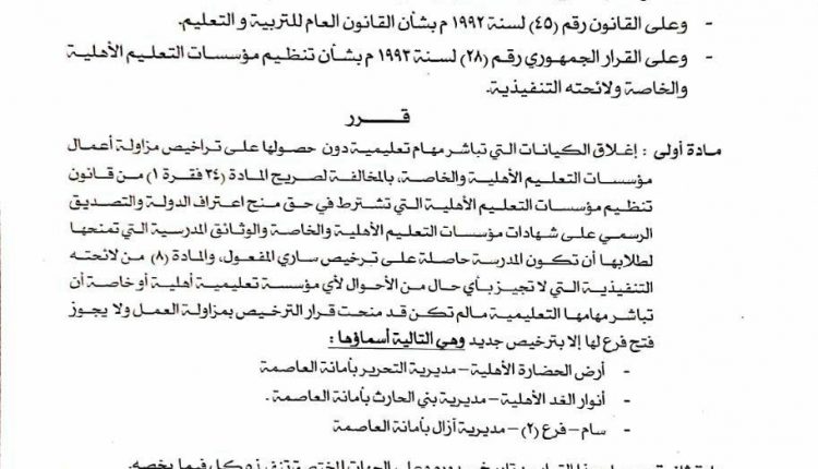 وزارة التربية تعلن عن إغلاق ثلاث مدارس أهلية
