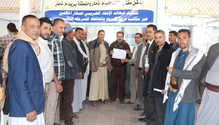 دشن مكتب الضرائب بمحافظة ذمار، اليوم، المرحلة الثانية من تسليم شهائد الاعفاء الضريبي الخاصة بضريبة الأرباح التجارية والمهن لفئة صغار المكلفين للعام 2023م، عبر مكاتب فروع البريد بالمحافظة.