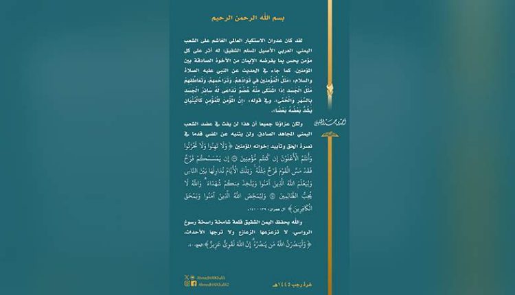 وأضاف “لقد كان عدوان الاستكبار العالمي الغاشم على الشعب اليمني العربي الأصيل المسلم الشقيق له أثر على كل مؤمن يحس بما يفرضه الإيمان من الأخوة الصادقة بين المؤمنين”، مردفا “لكن عزاؤنا جميعا أن هذا لن يفت في عضد الشعب اليمني المجاهد الصادق، ولن يثنيه عن المضي قدما في نصرة الحق وتأييد إخوانه المؤمنين”.