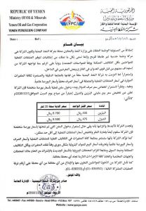أعلنت شركة النفط اليمنية مساء اليوم الاربعاء 28 نوفمبرعن زيادة التخفيض في اسعار المشتقات النفطية في السوق المحلية نظرا لاستمرار انخفاض سعر صرف الدولار وبدء دخول سفن نفطية باسعار بورصة منخفضة .