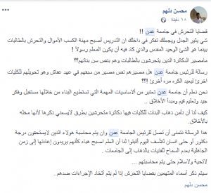 وهدد ” دلهم” بفضح المتورطين من أعضاء هيئة التدريس في قضايا التحرشات الجنسية بـ” الاسم ” إذا لم يتم اتخاذ الإجراءات القانونية الرادعة من قبل رئاسة الجامعة والتعليم العالي.