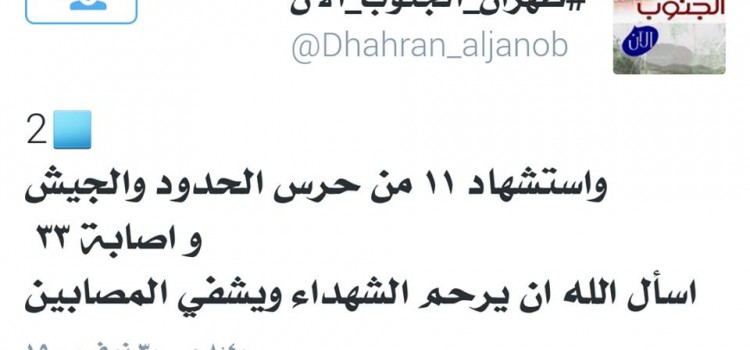 تناقلت وسائل الإعلام السعودية خبر مصرع 11 جندي سعودي واصابة 22 أخرين خلال المواجهات الأخيرة في جيزان ونجران وعسير