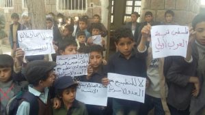 اقامت مدرسة الحمراء ومدرسة جمعة العامري ومجمع الإنتصار ومجمع الحسن بن علي ومدرسة خالد بن الوليد ومدرسة حطين في مديرية جبل الشرق، صباح اليوم وقفات احتجاجية رفضا للتطبيع وتنديدا بالتقرب من الكيان الصهيوني من قبل مايسمى وزير خارجية حكومة الفنادق تحت شعار “لا يرضى بالتطبيع إلا كل عربي وضيع”.