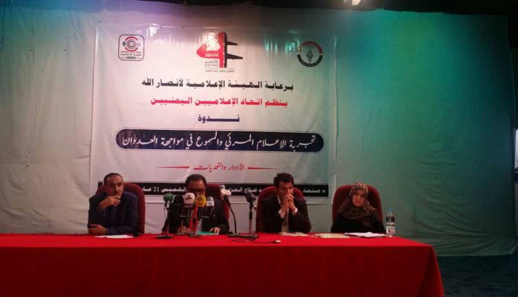 عٌقدت اليوم بصنعاء ندوة بعنوان “الإعلام المرئي والمسموع في مواجهة العدوان..الأدوار والتحديات” ، نظمها اتحاد الإعلاميين اليمنيين بالتنسيق مع الهيئة الإعلامية لأنصار الله.