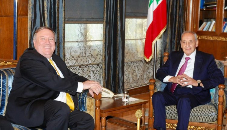 تناول رئيس مجلس النواب نبيه بري مع وزير الخارجية الأميركي مايك بومبيو، في عين التينة ظهر الجمعة “أهمية الحفاظ على الاستقرار في لبنان، وضرورة معالجة الحدود البحرية والتي تشمل المنطقة الاقتصادية الخاصة للبنان”. واستمر اللقاء ساعة، حيث أعرب الوزير بومبيو عن رغبة الولايات المتحدة الاميركية في “المساعدة مع جهود الأمم المتحدة لمعالجة هذا الموضوع”، حسب زعمه.