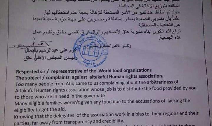 وفي الشكوى المرفوعة اتهم أبناء عتق ممثلي جمعية التكافل الإنساني بالتعسف وتوزيع المستحقات بالمحسوبية معولين ذلك بان ممثلها في مديرية عتق ” اخواني تابع لحزب الإصلاح” ولا مصداقية له.