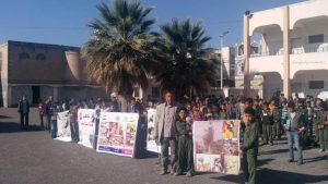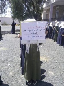 نظم معلمو وطلاب وطالبات مدارس خديجة بنت خويلد، وعائشة، وزيد الموشكي، والأمجاد، والمعرفة، والنور، وعلي بن أبي طالب، وخولة بنت الأزور، والفلوجة، والمعالي، والغد المشرق، والنصرالوحدوي؛ عددا من الوقفات الإحتجاجية تنديدا واستنكارا بجرائم العدوان والتي كان اخرها ماحدث من جريمة بشعه بحق الطفوله في صنعاء حيث قام طيران العدوان السعودي صهيوامريكي باستهداف مدرسة الراعي للبنات بمنطقة شعوب بصنعاء سقط خلالها العديد من الشهداء والجراحى من طالبات.