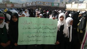 نظم طلاب مجمع اسماء التربوي بمديرية ضوران اليوم الثلاثاء، وقفة إحتجاجية ادانة واستنكارا لما قام به طيران العدوان السعودي الصهيوامريكي من قصف وحشي بربري على محيط مدرسة الراعي للبنات بحي سعوان بالعاصمة صنعاء حيث نتج عن القصف. العديد من الشهداء والجرحى من طالبات.