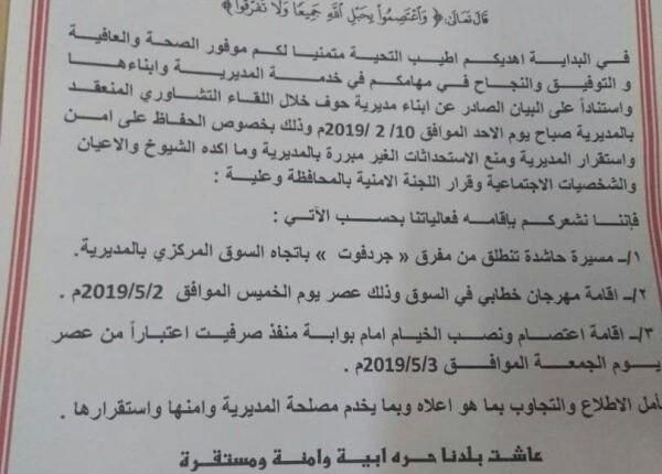 وقال بيان المظاهرة، “إن مسيرة جماهيرية ستقام عصر اليوم الخميس تنطلق من مفرق جردفوت باتجاه سوق المديرية، يليله اقامة مهرجانا جماهيريا في السوق”.