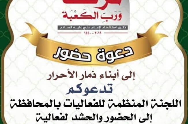 الدعوة عامة .. لأبناء ذمار للحضور والمشاركة في فعالية استشهاد الإمام علي عليه السلام بمدينة ذمار.