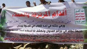 ودعا قبائل آنس في بيان صادر عن الوقفة الاحتجاجية حصل “ذمار نيوز” على نسخة منه: كل مشايخ وعقلاء وقبائل اليمن للنكف القبلي بشأن هذه الجريمة المنافية للدين والأعراف القبلية والعهود والمواثيق الأخلاقية والإنسانية، باعتبار ذلك عيباً اسود في وجيه المجرمين.
