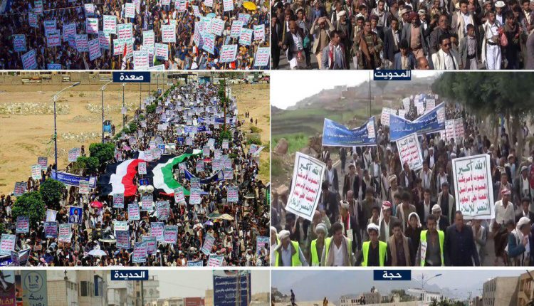 ورفع المشاركون في المسيرات, الشعارات المنددة بالتدخلات الأمريكية في اليمن والمنطقة وما تقدمه أمريكا من دعم وعتاد حربي لتحالف العجوان لقصف وقتل الشعب اليمني.