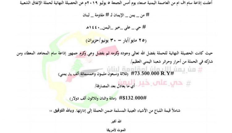 أعلنت إذاعة سام أف إم اليوم عن حصيلة حملة الإنفاق الشعبية “من يمن الإيمان لمقاومة لبنان حي على خير اليمن 1440 هـ” والتي بلغت 73 مليون و500 ألف ريال.