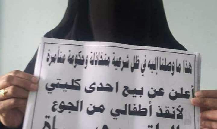 اضطرت امرأة يمنية إلى الإعلان عن بيع كلية أحد أطفالها ليعيش الأربعة الاخرين بعد أن أصبحت عاجزة عن توفير أدنى متطلبات الحياة لأطفالها بسبب انقطاع راتب زوجها المتوفي الذي قتل في صفوف القوات الموالية للفار هادي في جيزان.