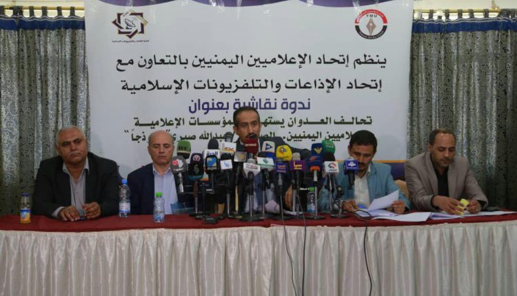 نظم اتحاد الإعلاميين اليمنيين واتحاد الإذاعات والتلفزيونات الإسلامية اليوم ندوة نقاشية حول “استهداف تحالف العدوان للمؤسسات الاعلامية والإعلاميين اليمنيين.. الصحافي عبدالله صبري أنموذجاً”.