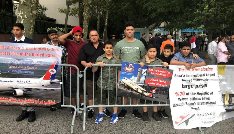 وقفة احتجاجية أمام مبنى الأمم المتحدة في نيويورك للمطالبة بفتح مطار صنعاء