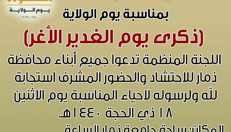 دعوة عامة لأبناء محافظة ذمار لحضور فعالية ذكرى ولاية الإمام علي عليه السلام.