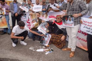 ووضع المحتجون صور ولي عهد أبو ظبي محمد بن زايد تحت أقدامهم، كما قاموا بإحراقها، استجابة لدعوة اطلقها ناشطين تابعين لحكومة المستقيل “هادي” وحزب الإصلاح خلال اليومين الماضيين.