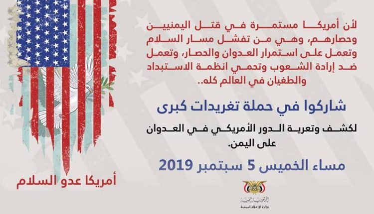 دعت وزارة الإعلام، إلى المشاركة الواسعة في حملة التغريدات التي ستطلقها الوزارة الساعة الثامنة من مساء اليوم تحت شعار “أمريكا عدو السلام”.