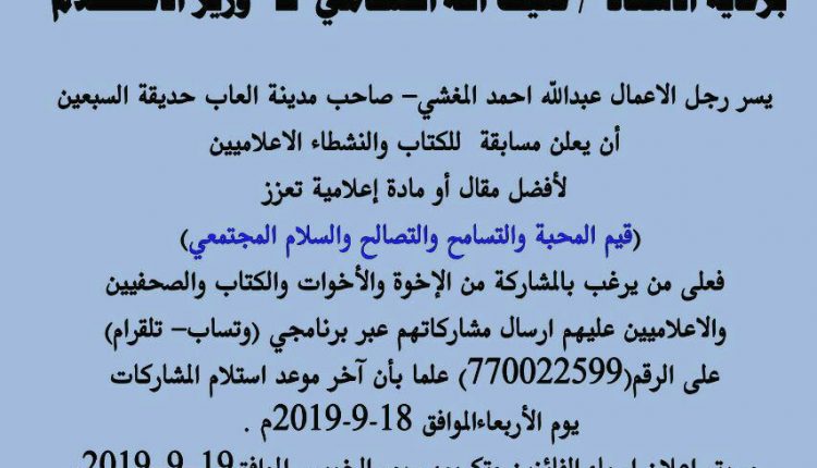 وفي ذات السياق أطلقت إدارة مدينة الألعاب مسابقة للإعلاميين والكتاب والناشطين في مختلف وسائل التواصل الاجتماعي تتضمن كتابة تقرير أو مقال عن “تعزيز قيم المحبة والإخاء والتسامح المجتمعي” بين أبناء الوطن الواحد، بالتزامن مع إعلان المجلس السياسي الأعلى عن تشكيل فريق المصالحة الوطنية الشاملة والحل السياسي.