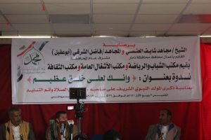 ولفت الوكيل المروني الى ضرورة الإقتداء والتأسي بالرسول الأعظم في كل جوانب الحياة والتحرك بما جاء به، مضيفاً ان الشعب اليمني لايزال يحيي ذكرى مولد النبي حتى وهو يمر بمرحلة عدوان وحصار وهو يواجه جاهلية العصر التي أشار اليها الرسول الأكرم.