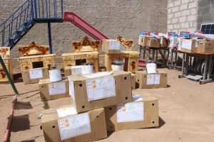 وفي فعالية الإفتاح وزعت 21 حالة مساعدة لمختلف المهن التي تساعد في تأهيل النساء المعدمات .