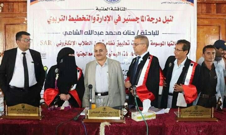 منحت جامعة ذمار الباحثة حنان محمد الشامي الماجستير بامتياز في الإدارة والتخطيط التربوي عن رسالتها الموسومة بـ: “معوقات تطبيق نظام شؤون الطلاب الإلكتروني SAR في الجامعات اليمنية وسبل معالجتها.