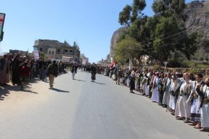 وفي الوقفة التي حضرها نائب مدير أمن المديرية رائد ابو يحيى الجرموزي ومدير مكتب التربية والتعليم أ٠محمد محمد شمس الدين وعدد من اعضاء السلطة المحلية والمجلس الإشرافي والمشائخ والقطاع التربوي والشخصيات الإجتماعية اكد الأمين العام الشيخ أمين عبده ضورة أهمية تعزيز إنتصارات الجيش واللجان الشعبية والأجهزة الأمنية من خلال التحشيد للجبهات ودعم المرابطين بالرجال والمال.