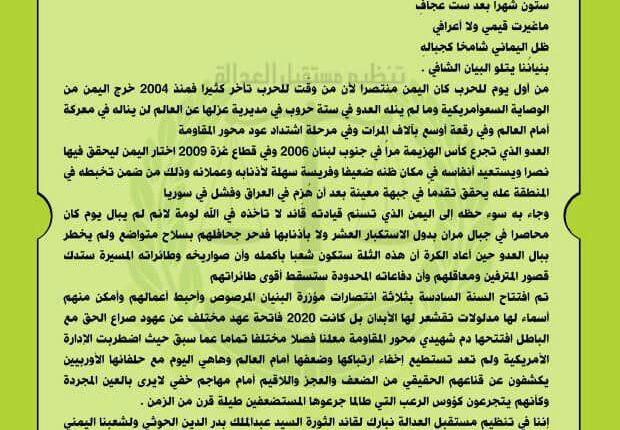 إننا في تنظيم مستقبل العدالة نبارك لقائد الثورة السيد عبدالملك بن بدر الدين الحوثي ولشعبنا اليمني حكومة وشعبا ولأولئك المجاهدين الأبطال الذين زلزلوا عروش الظالمين هذا الصمود والثبات المنقطع النظير وندعو أبناء شعبنا اليمني إلى المزيد من الصبر والوعي والثبات ونناشد شعوب أمتنا أن تخرج من صمتها وتخلع ثياب الخنوع فالفرصة سانحة لتوحيد الصفوف وجمع شتاتها لمواجهة مشاريع المستكبرين