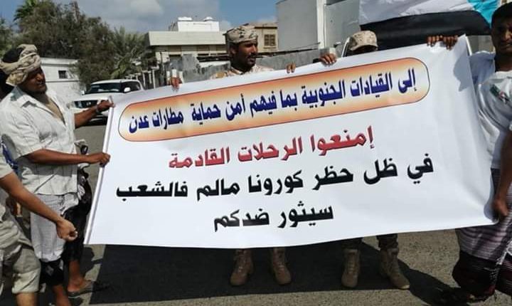 واتهم المحتجون الذين تجمعوا أمام بوابة مطار عدن الرئيسية، السعودية التعمد بنشر كورونا من خلال استمرار تسيير الرحلات العسكرية والمدنية عبر جنودها إلى المدينة.
