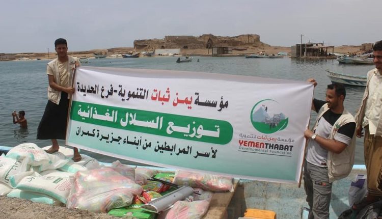 مؤسسة يمن ثبات توزع 150 سلة غذائية لأسر المرابطين من أبناء جزيرة كمران بالحديدة