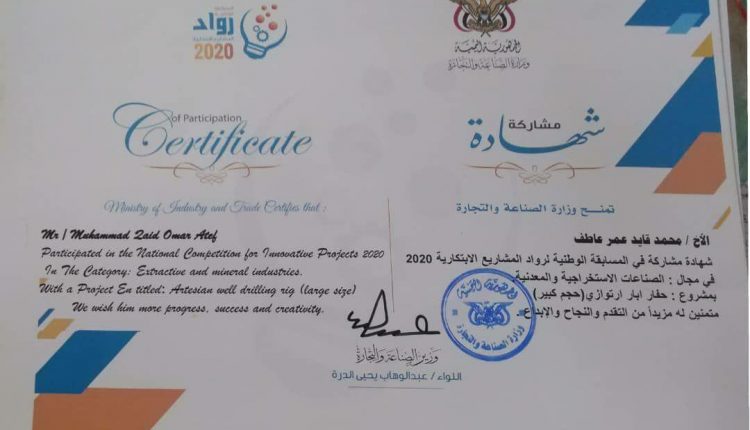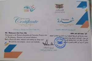 ج/ تفاعلاً مع المسابقة الوطنية لرواد المشاريع الإبتكارية وألتي أطلقها رئيس المجلس السياسي الأعلى، تقدمنا بمشروعنا وبفضل الله وتوفيقه حصلنا على لقب الرائد والفائز الأول على مستوى الجمهورية ، وكانت الجائزة الأولى من نصيبنا وتتكون من سيارة وبراءة اختراع ورسالة شكر وتكريم من قبل وزارة الصناعة والتجارة .