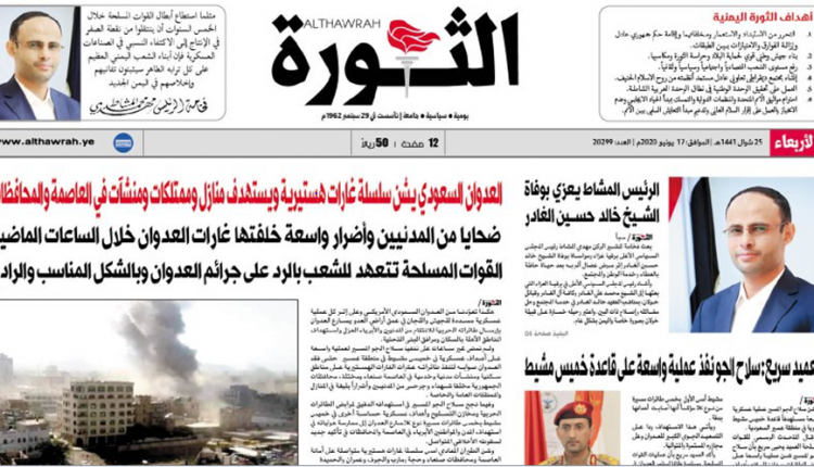 اهتمت الصحافة المحلية اليوم، بالتصعيد المتواصل لتحالف العدوان الأمريكي السعودي الإماراتي في مختلف محافظات الجمهورية، وبالعملية الواسعة التي نفذها سلاح الجو المسيرة بالجيش واللجان الشعبية ردا على هذا التصعيد.. كما أولت الصحافة اهتماما بالقرار الأممي الخطير الذي قضى برفع دولة العدوان السعودية من القائمة السوداء لقتلة الأطفال ومن أهم عناوين الصحف لهذا اليوم التالي :-