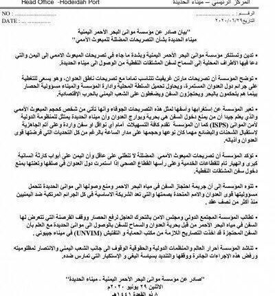 وأكد البيان أن المؤسسة تقدم كافة التسهيلات وهو مفتوح أمام أي سفن واردة وعلى أتم الجاهزية لإستقبال الشحنات والبضائع مهما كان نوعها وحجمها على مدار الساعة بالرغم من كل التحديات التي فرضتها قوى العدوان وأذيالها.