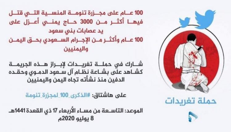 تنطلق الساعة التاسعة من مساء اليوم حملة تغريدات ” على موقع التواصل الاجتماعي “تويتر” بمناسبة مرور 100 عام على مجزرة تنومة المنسية التي قتل فيها أكثر من 3000 حاج يمني أعزل على يد عصابات بن سعود..” 100 عام وأكثر من الإجرام السعودي بحق اليمن واليمنيين”