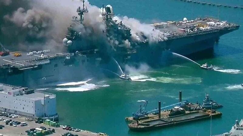 تم إخماد الحريق في هذه السفية، التي اشتعلت فيها النيران في قاعدة بحرية في “سان دييغو” بكاليفورنيا بعد احتراقها لمدة أربعة أيام، والصور التي انتشرت بعد الحريق تظهر أضرارًا كبيرةً في أجزاء مختلفة من السفينة. وآثار التدمير في جزء كبير من جسر القيادة والأجزاء الداخلية وحتى انثقاب أجزاء كبيرة من سطح الطائرة، وضعت بقاء هذه السفينة في الخدمة وإصلاحها موضع شکوك کبيرة.