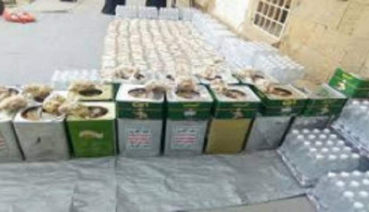 تضمنت القافلة مواد غذائية وفرش وبطانيات وأغنام ومبالغ مالية ومحاصيل الحبوب بلغت قيمتها خمسة ملايين ريال.