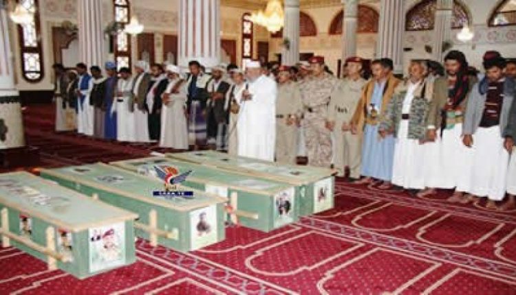 جرت مراسم التشييع للشهداء الذين توشحت جثامينهم بالعلم الجمهوري بعد الصلاة عليهم بجامع الشهداء بأمانة العاصمة، ليتم مواراتهم الثرى كل شهيد في مسقط رأسه.