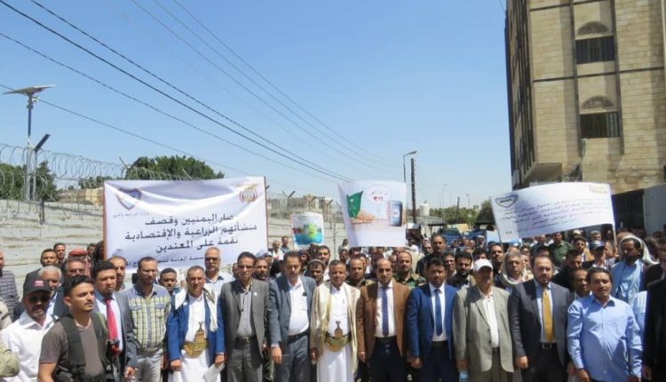 وجددت وزارة الزراعة استنكارها لاستمرار العدوان في ارتكاب المجازر بحق المدنيين واستهداف المنازل وتدمير البنية التحتية والمؤسسات المدنية ومحطات الوقود في ظل صمت وتواطؤ دولي .. لافتاً إلى أن تنظيم الوقفات الاحتجاجية للعاملين في القطاع الزراعي رسالة للعالم بصمود الشعب اليمني بمختلف فئاته وشرائحه ومزارعيه في وجه العدوان.