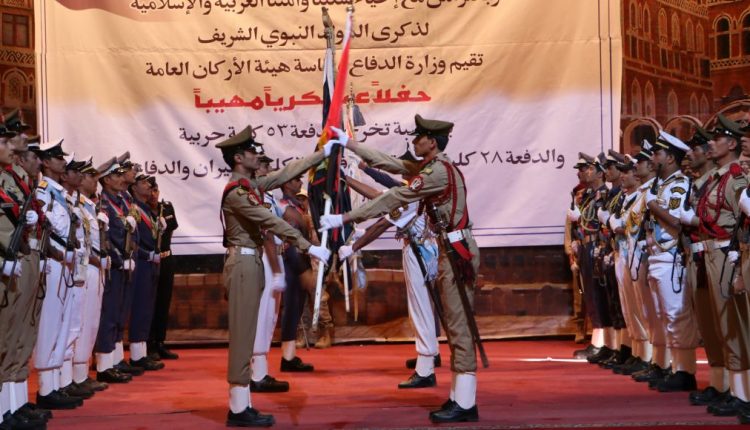 أٌقيم بصنعاء اليوم احتفال عسكري بتخرج الدفعة 53 من الكلية الحربية والدفعة 28 من الكلية البحرية والدفعة 35 من كلية الطيران والدفاع الجوي بالتزامن مع إحياء ذكرى المولد النبوي.