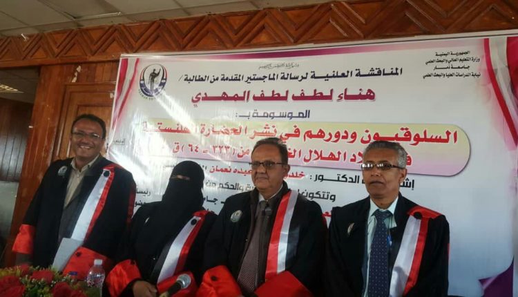 حصلت الباحثة هناء لطف المهدي على درجة الماجستير بامتياز في مجال التاريخ والعلوم السياسية من جامعة ذمار عن رسالتها الموسومة بــ “السلوقيون ودورهم في نشر الحضارة الهلنستية في بلاد الهلال الخصيب من (64 – 323) ق.م.