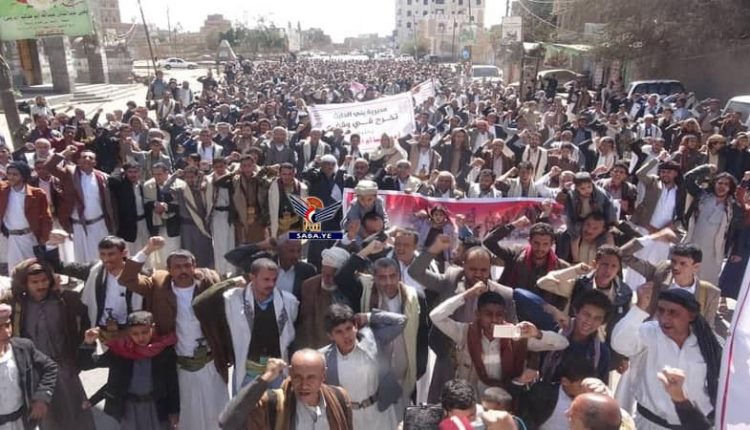 كما استنكر أبناء وقبائل مديرية بني الحارث بأمانة العاصمة في مسيرة ووقفة أقيمت اليوم، قرار الإدارة الأمريكية بتصنيف أنصار الله منظمة إرهابية.