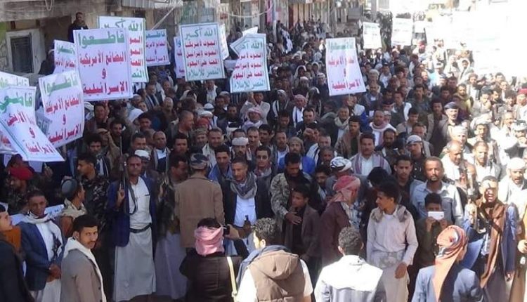 فيما أدان أبناء المربع الغربي الذي يضم مديريات العدين وفرع العدين وحزم العدين ومذيخرة، في المسيرة الجماهيرية التي أقيمت في العدين، استمرار الحصار الأمريكي.
