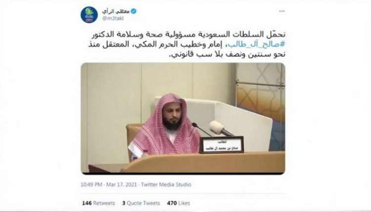 وحمل الموقع في سلسلة تغريدات له السلطات السعودية مسؤولية سلامة إمام وخطيب الحرم المكي صالح ال طالب المعتقل منذ نحو سنتين ونصف السنة بلا سبب قانوني، مؤكدا أن القضاء في المملكة يفتقر إلى الاستقلالية والشفافية والاستئناف، وهو لعبة بيد النظام لتشديد العقوبات على معتقلي الرأي.