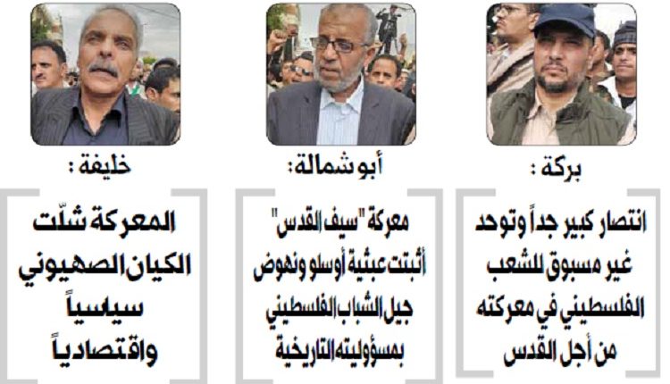 أكد ممثلو الفصائل الفلسطينية المقاومة في العاصمة صنعاء أن معركة “سيف القدس” والنصر الذي تحقق من خلالها كبير جدا ويفوق بمرات ما تحقق خلال جولات الصراع الأربع منذ 2008م ، وأشاروا إلى أن الانتصار في معركة “سيف القدس” فتح الباب على معادلة جديدة ووضع مختلف عما ألفه العدو الصهيوني منذ 73 عاما من الاحتلال لفلسطين ، وو28 عاما من المسار العبثي في البحث عن السلام المذل في مفاوضات أوسلو .