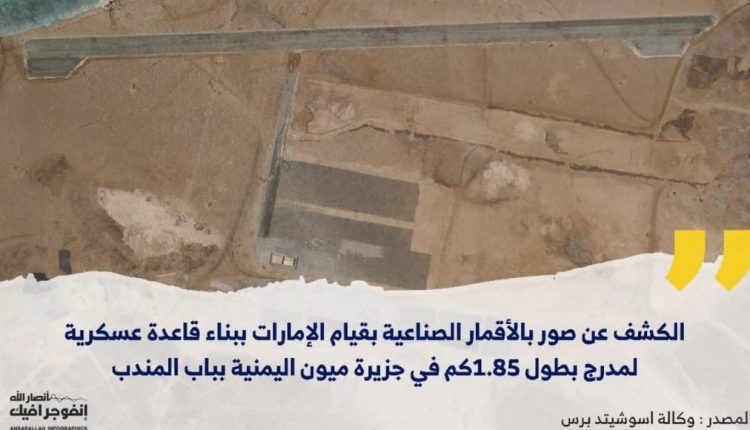 وأوضحت الوكالة أن “المدرج يسمحُ لمن يسيطر عليه بإبراز قوته في المضيق وشن غارات جوية بسهولة على البر الرئيسي لليمن، كما أنه يوفر قاعدةً لأية عمليات في البحر الأحمر وخليج عدن وشرق إفريقيا القريب”.