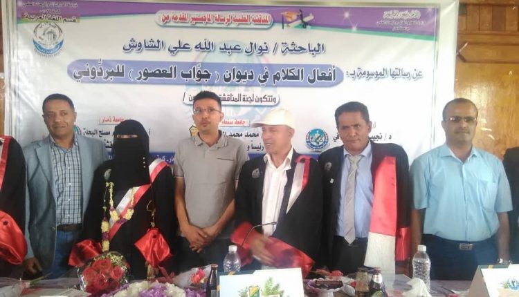 حصلت الباحثة نوال عبدالله علي الشاوش، على درجة الماجستير بامتياز، من قسم اللغة العربية بكلية الآداب جامعة ذمار، عن رسالتها الموسومة ب: «أفعال الكلام في ديوان جواب العصور للبردوني».
