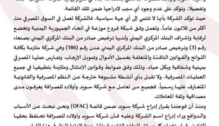 أكدت شركة سويد وأولاده للصرافة عدم وجود أي سبب لإدراجها ضمن قائمة الحظر الأمريكي، نافية بشدة ما جاء في تقرير وزارة الخزانة الأمريكية حول الشركة.