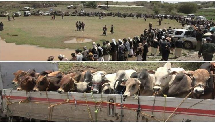 القافلة التي قدمتها قبائل زُبيد خلال لقاء قبلي مسلح احتوت على عدد من المواشي والمواد الغذائية.